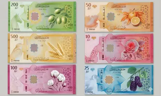 - الأوراق النقدية: 50، 100، 200، 500، 1000، 2000، 5000 ليرة سورية